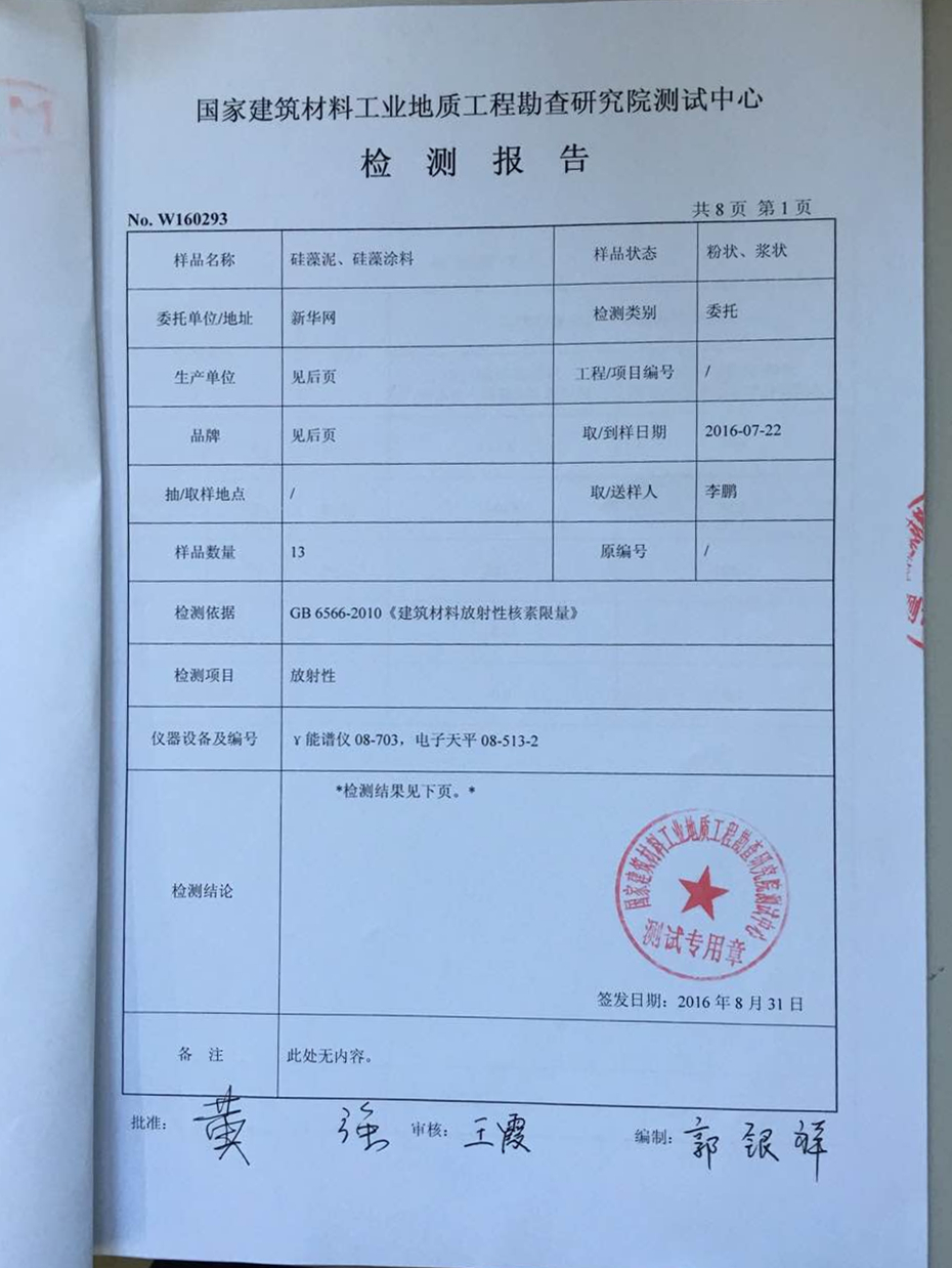 2016年7月,在新华网、中国消费者报、中国建材报等媒体发起的“硅藻泥质量中国行”活动中(详情见新华网硅藻泥质量中国行专题),由媒体记者组成的调查团针对网络上闹得沸沸扬扬的“硅藻泥放射性核素超标”问题组织了一次抽检活动。记者共探访硅藻泥行业的13家主要品牌厂商,深入车间进行随机抽样。7月22日,新华网主任记者李鹏将13件样品送至国家建筑材料工业地质工程勘察研究院测试中心进行检测。检测结果显示:13家品牌的产品全部符合国家标准,抽检合格率为100%。