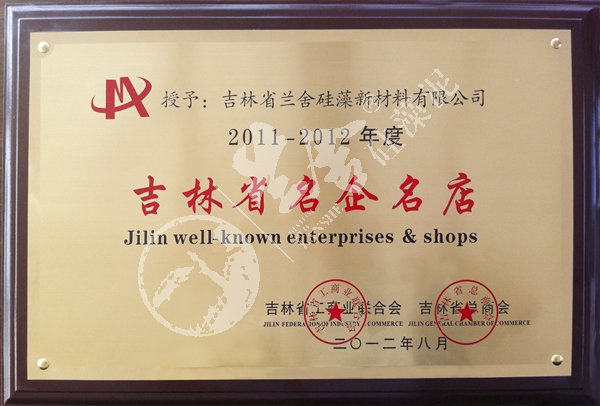 近日,在刚刚公布的 “2011--2012年度吉林省名企名店”名单中,吉林省兰舍硅藻新材料有限公司在众多参评单位中,脱颖而出,获得此项殊荣。