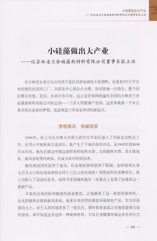 为弘扬吉商文化,传承吉商精神,由中共吉林省委宣传部编撰的《天下吉商》一书近日由时代文艺出版社出版发行。作为硅藻泥行业的代表人物,兰舍硅藻泥董事长张立功的事迹《小硅藻做出大产业》,成为传递“兰的幽雅,舍的胸怀”兰舍精神,发扬“重德重义、敢闯敢为、善融善创、思源思报”吉商精神的代表。