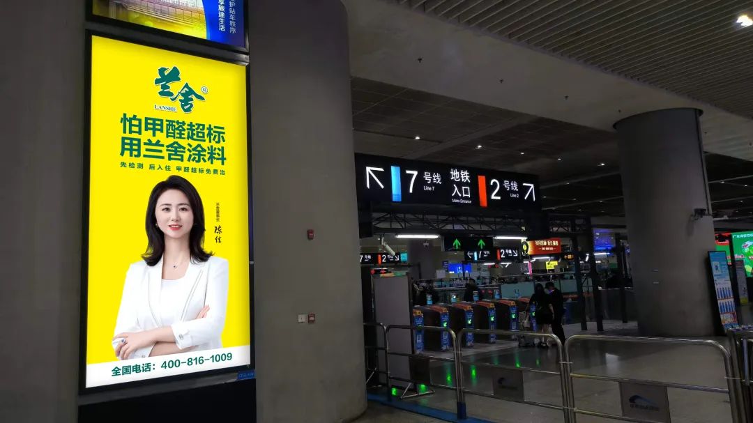 明亮的吸睛黄,简洁时尚的品牌广告设计,为消费者带来强烈的视觉冲击,成为了来往旅客绕不开的视觉焦点,并形成“怕甲醛超标,用兰舍涂料”的品牌记忆点!